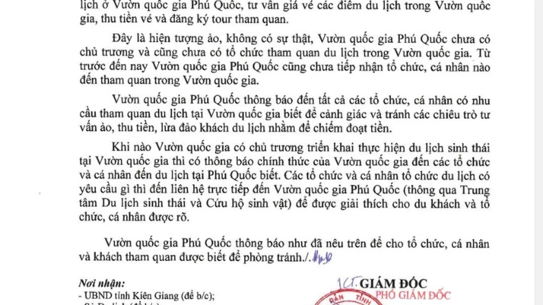 Ông Huỳnh Văn Tiến, Phó Giám đốc Vườn quốc gia Phú Quốc cho biết, Vườn thông báo đến tất cả các tổ chức, cá nhân có nhu cầu tham quan, du lịch tại Vườn biết để cảnh giác và tránh các chiêu trò tư vấn giả mạo, thu tiền, lừa đảo du khách du lịch nhằm chiếm đoạt tiền.