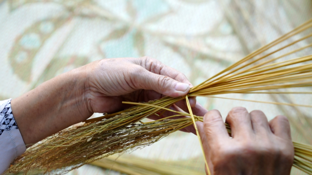 Sợi rơm cuối cùng ở đầu chổi sẽ được bà Mận tết lại để làm thành móc treo. Thông thường, đối với người lành nghề, để làm ra chiếc chổi to sẽ mất 2 ngày, còn chổi bé khoảng 15-20 phút là xong.