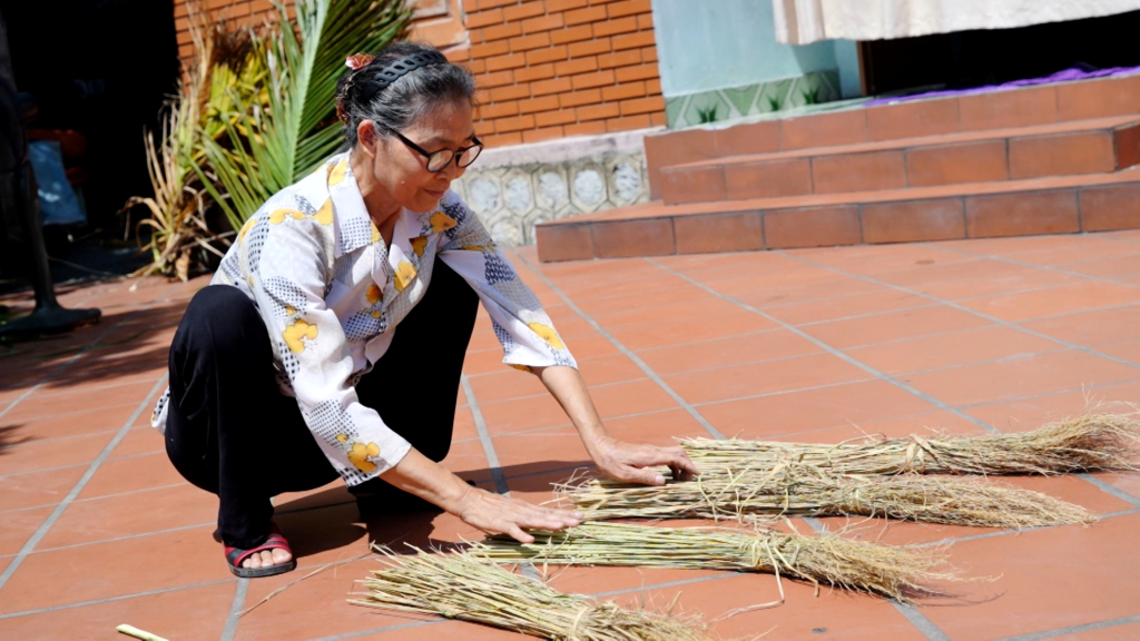 Để làm được những chiếc chổi rơm, phải chọn rơm của những cây lúa nếp bởi sợi rơm nếp dai hơn, màu sắc vàng óng nên làm chổi cũng đẹp hơn. Rơm được đem phơi khô khoảng 3-4 nắng, sau đó rút lấy phần lõi cứng của rơm, buộc thành từng cụm nhỏ, mỗi cụm gọi là một con rơm. Cứ 5 con rơm như thế ghép lại thành 1 chiếc chổi.
