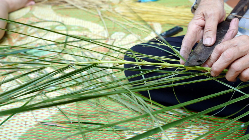 Bà Liên chia sẻ: Bước khó nhất khi làm chổi chính là việc phải dùng dây cao su quấn chặt để cố định phần cán chổi sao cho tròn đều. Với chổi cau, thường thì cây cau rất cao, chỉ lấy được những tàu lá cau rụng xuống gốc, đã khô nên quá trình tách để lấy sống lá sẽ dai và khó hơn một chút. Khi buộc cần lưu ý xếp các tàu lá sao cho phần bụng lá quay xuống dưới và giữa các tàu lá có độ xòe để dễ quét hơn.