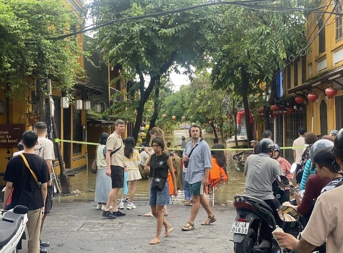 Trận lụt lịch sử vừa quét qua khu phố cổ Hội An chưa dọn xong bùn thì nước lũ lại từ sông tràn vào và dâng cao trở lại. Dù vậy lượng khách đổ về tham quan vẫn khá đông.