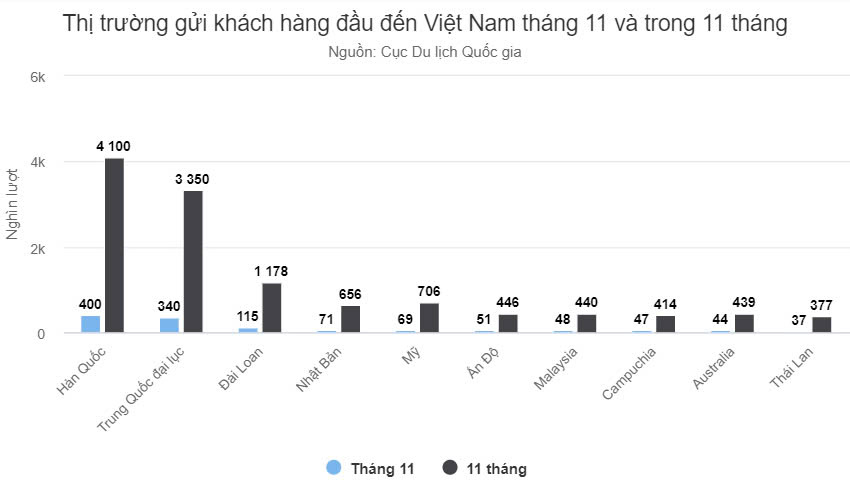 Số liệu thống kê hôm 6/11 của Cục Du lịch Quốc gia chỉ ra trong 11 tháng đầu năm, Hàn Quốc là tệp khách hàng lớn nhất, tiếp theo là Trung Quốc đại lục, Ấn Độ, Mỹ, Nhật, Australia. Tuy nhiên, ngoài các thống kê về lượt khách, ngành du lịch Việt chưa có nhiều dữ liệu chi tiết khác như chi tiêu và lưu trú.