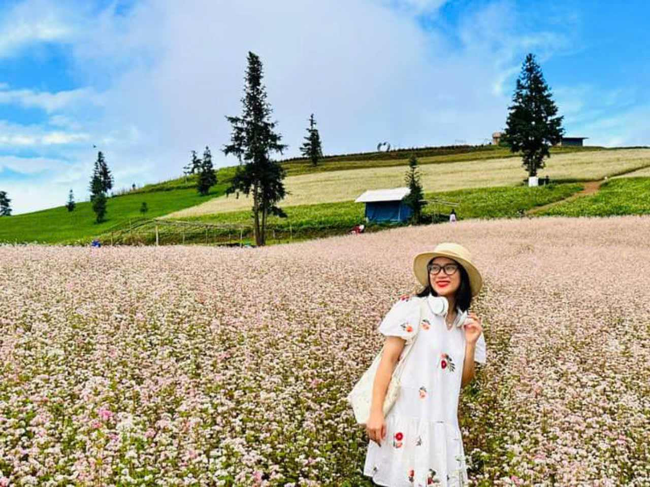 Đắm chìm giữa vẻ đẹp nhẹ nhàng, bình dị của hoa tam giác mạch, chị Bùi Hòa cho biết khung cảnh rất ấn tượng và thanh sơ. Trên thảo nguyên, mây trắng bay liên tục, lúc trời xanh, lúc phủ mây mờ làm chị rất thích thú.