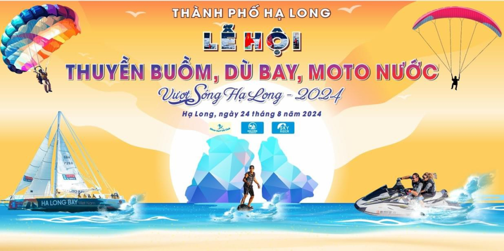 Lễ hội thuyền buồm, dù bay, moto nước trên Vịnh Hạ Long với tên gọi “Vượt sóng Hạ Long – 2024” sẽ khai mạc vào 17h30 ngày 24/8 tại khu vực vùng nước đối diện Vincom và Công viên Hoa Hạ Long. Lễ hội do UBND thành phố chủ trì tổ chức với sự tham gia đồng hành, hỗ trợ của CLB Thuyền buồm Hạ Long – Ha Long Sailling Club; Dù bay của Công ty CP Thể thao và Du lịch Gió Biển (Team Sky Rider); Câu lạc bộ Ván phản lực Silver Surf Việt Nam; Công ty TNHH Dịch vụ du thuyền VMES; Câu lạc bộ mô tô nước Hạ Long…